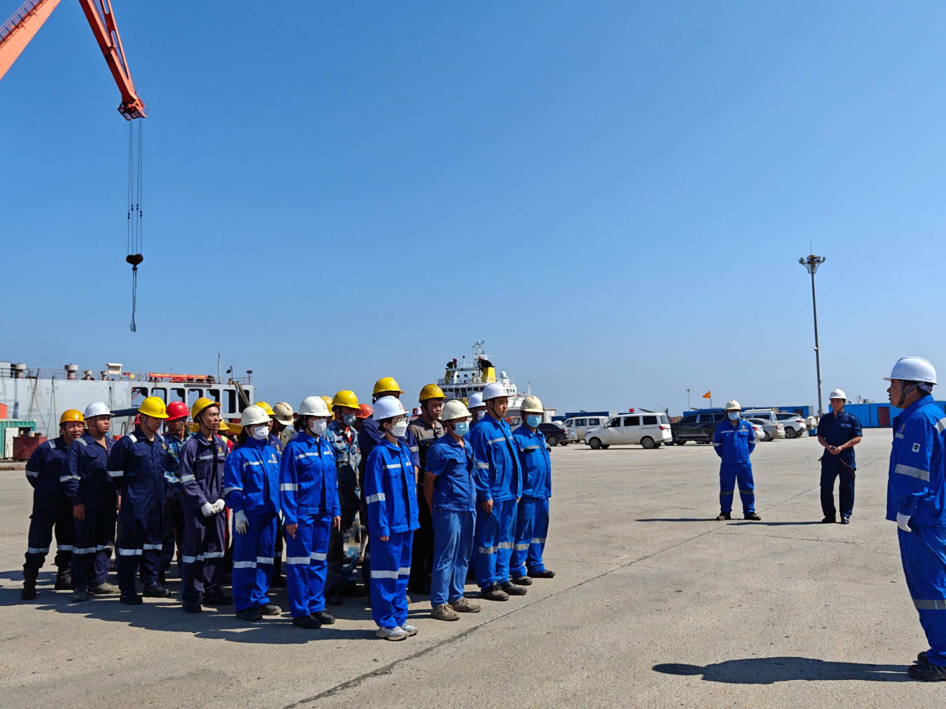 上午11點,安全環(huán)保部監(jiān)督在碼頭集合員工,針對此次演練進行應(yīng)急教育培訓(xùn)和安全交底。他強調(diào)了環(huán)保意識的重要性,并介紹了應(yīng)對泄油事件的基本步驟和措施。隨后,總經(jīng)理下達演練開始命令。